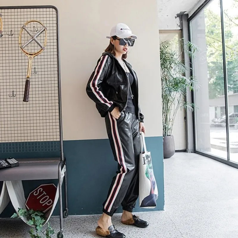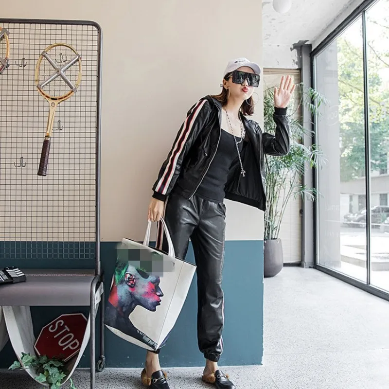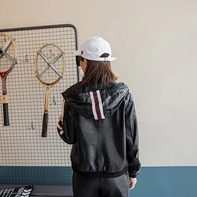 Hot Deal Spring New Sheepskin Leather Hooded Jacket Women Zipper Genuine Leather Color Mixed Short Fashion B